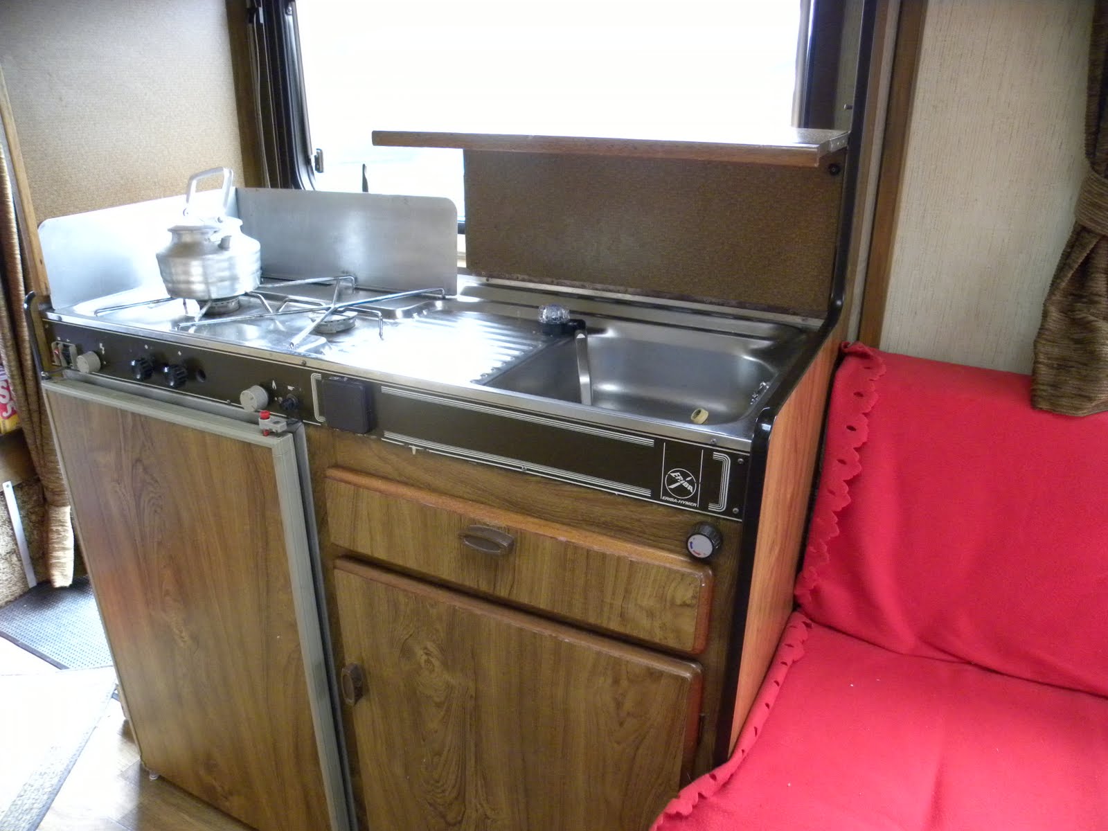 The galley is very compact with the gas stove and sink on top and the fridge and cupboard for pots etc underneath.