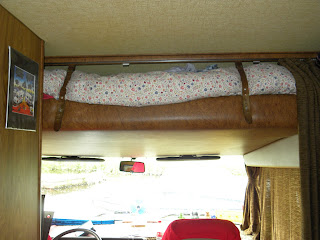 The bed above the seats is very comfy and is full double bed size. When in use it comes down over the seats just above the dashboard. Of course it has the advantage of being close to the ensuite.