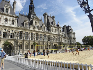 The beach volleyball has been set up outside the town hall which has cornered the market in statues.