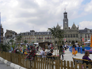 We stopped in St Quentin to catch up with Thomas’s again and had a very enjoyable night at a chinese restaurant with their guests Deitmar and Margit from Germany and Lois and Bob. While walking around town looking for the laundromat we came across St Quentin Plage. The French have a lovely way for the summer of bringing the beach to the people and create a beach setting for the summer in the main square. Flowers and seating for the older generation and tons of beach sand, a swimming pool and water games for the young ones. It is quite a sight with sandcastles in front of the historical Town Hall.