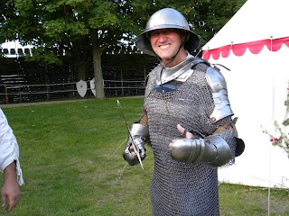 What a fabulous night. We walked over at 7.30pm and in the grounds were stalls of a mediaeval flavour. Kevin was intrigued by the fellow showing his collection of a foot soldiers chain mail and armour from the 14th century. Fortunately the fellow could speak english and happily dressed Kevin in all of his gear. The chainmail weighed about 13 kilo and the rest of it added up to carrying around 27 kilo. No wonder they had to stand and fight it would have been impossible to run away.
